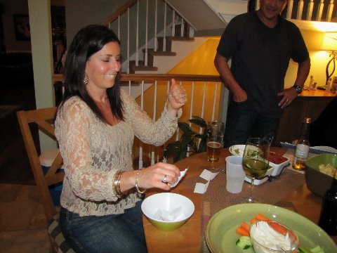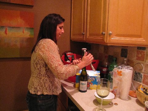 Kim – trying to unsuccessfully open a bottle of wine