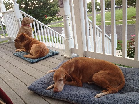 Sitting on the porch, relaxing with the dogs!