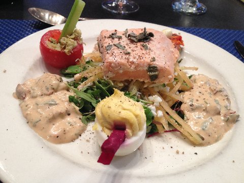 Parissienne salad topped with salmon –