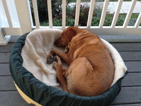 Chester all tuckered out – not quite fitting in the bed