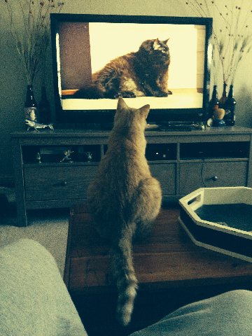friend Jeff’s cat, Simcoe, enjoying a TV show with cats.