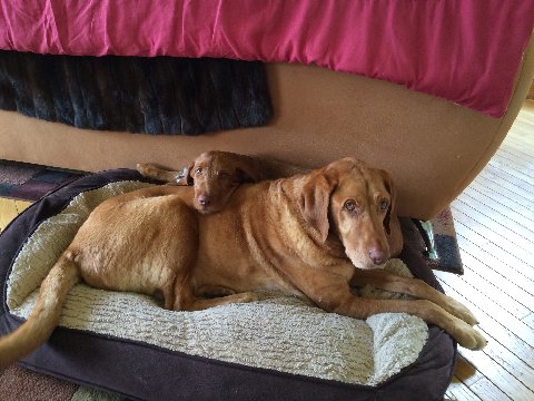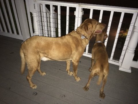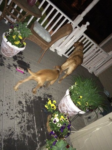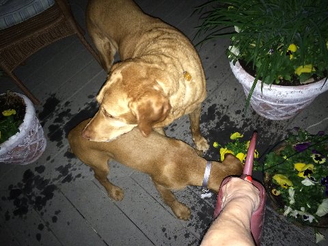 | the dogs were helping me water neighbor Denise’s plants |