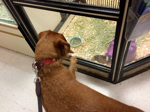 | Weasel VERY interested in the guinea pig…. |