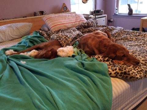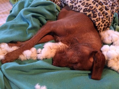 Weasel sleeping in with her rabbit scarf/toy